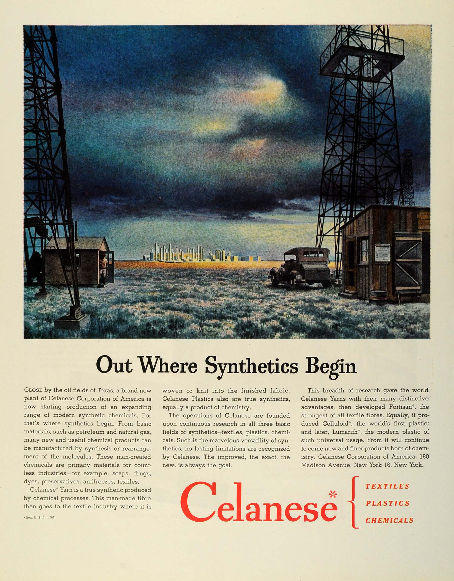 This is an original 1945 color print ad for the Celanese Textile, Plastics and Chemicals from Celanese Corporation of America located 180 Madison Avenue, New York City.