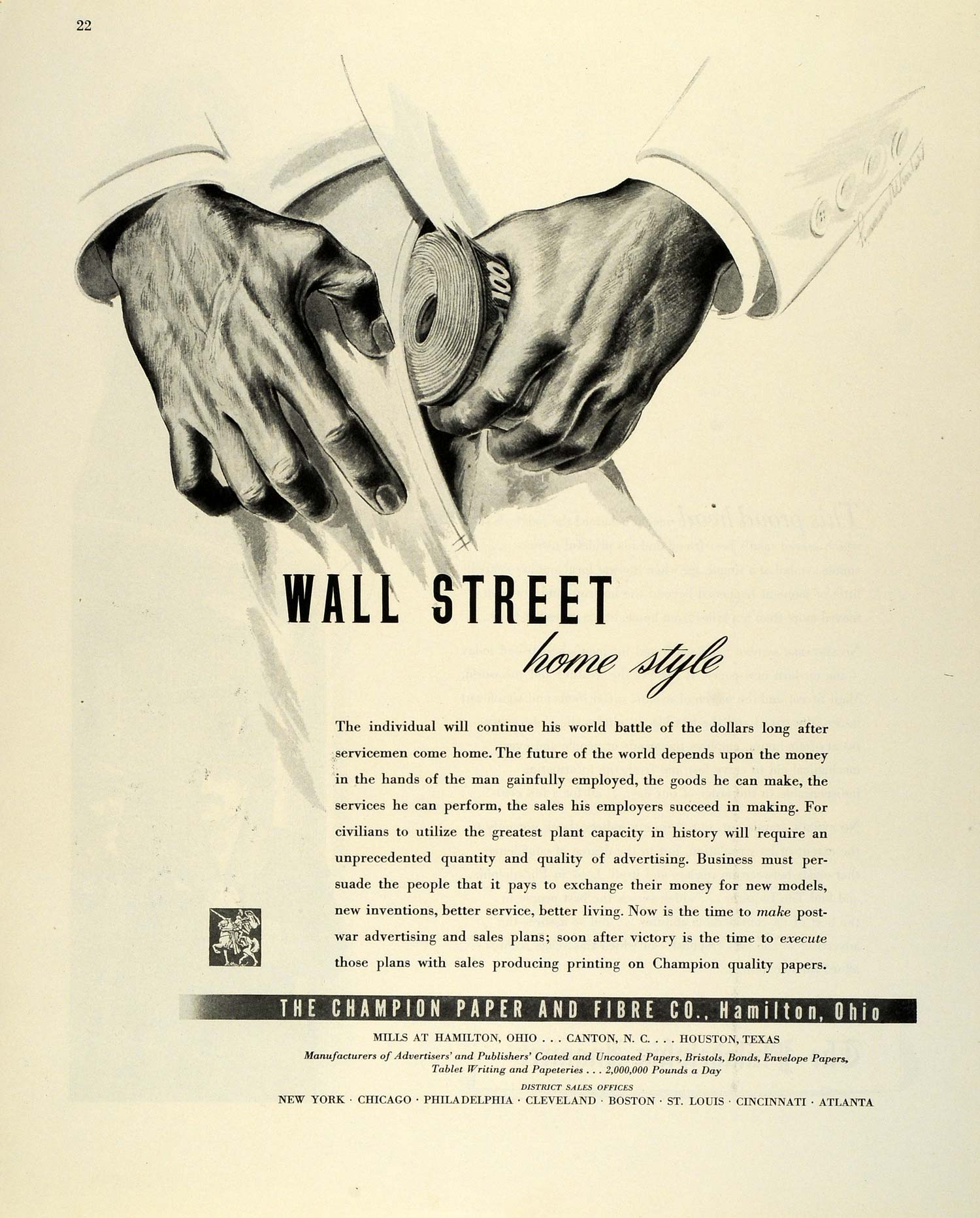 This is an original 1945 black and white print ad for the Champion Paper and Fibre Company, manufacturers of advertisers and publishers coated and uncoated papers, bristols, bonds, envelope papers, and tablet writing and papeteries; located in Hamilton, Ohio.