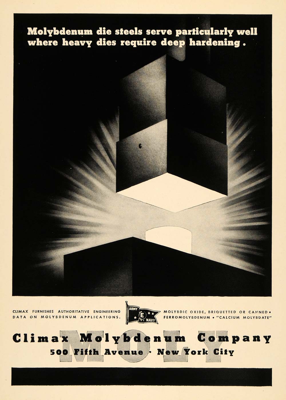 This is an original 1945 black and white print ad for the Climax Molybdenum Company located at 500 Fifth Avenue, New York.