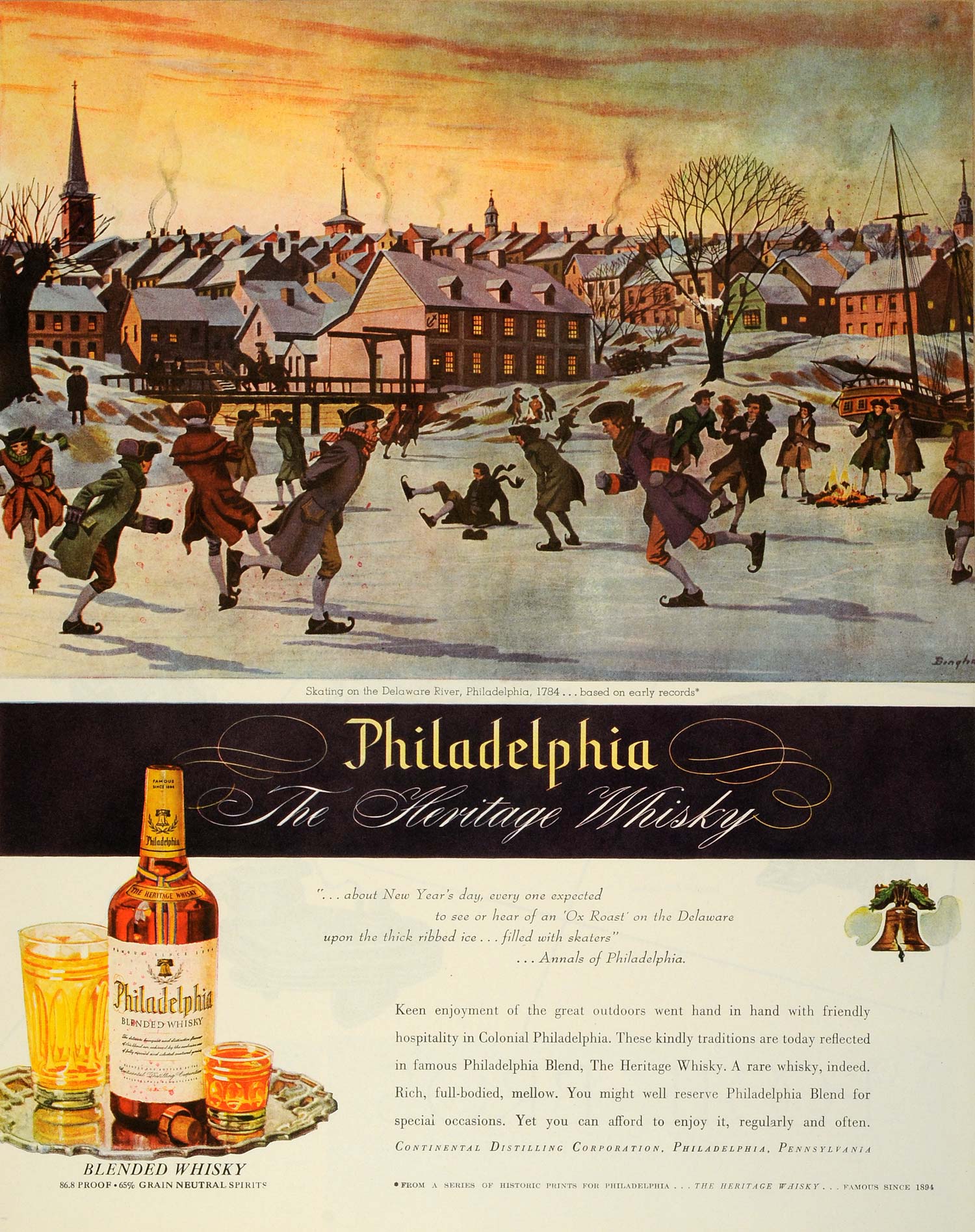 This is an excellent original 1945 color print ad for the Philadelphia Blended Whisky from Continental Distilling Corporation located in Philadelphia, Pennsylvania. This ad features a painting of early Americans skating on the Delaware River, Philadelphia, 1784; by the artist James R. Bingham.