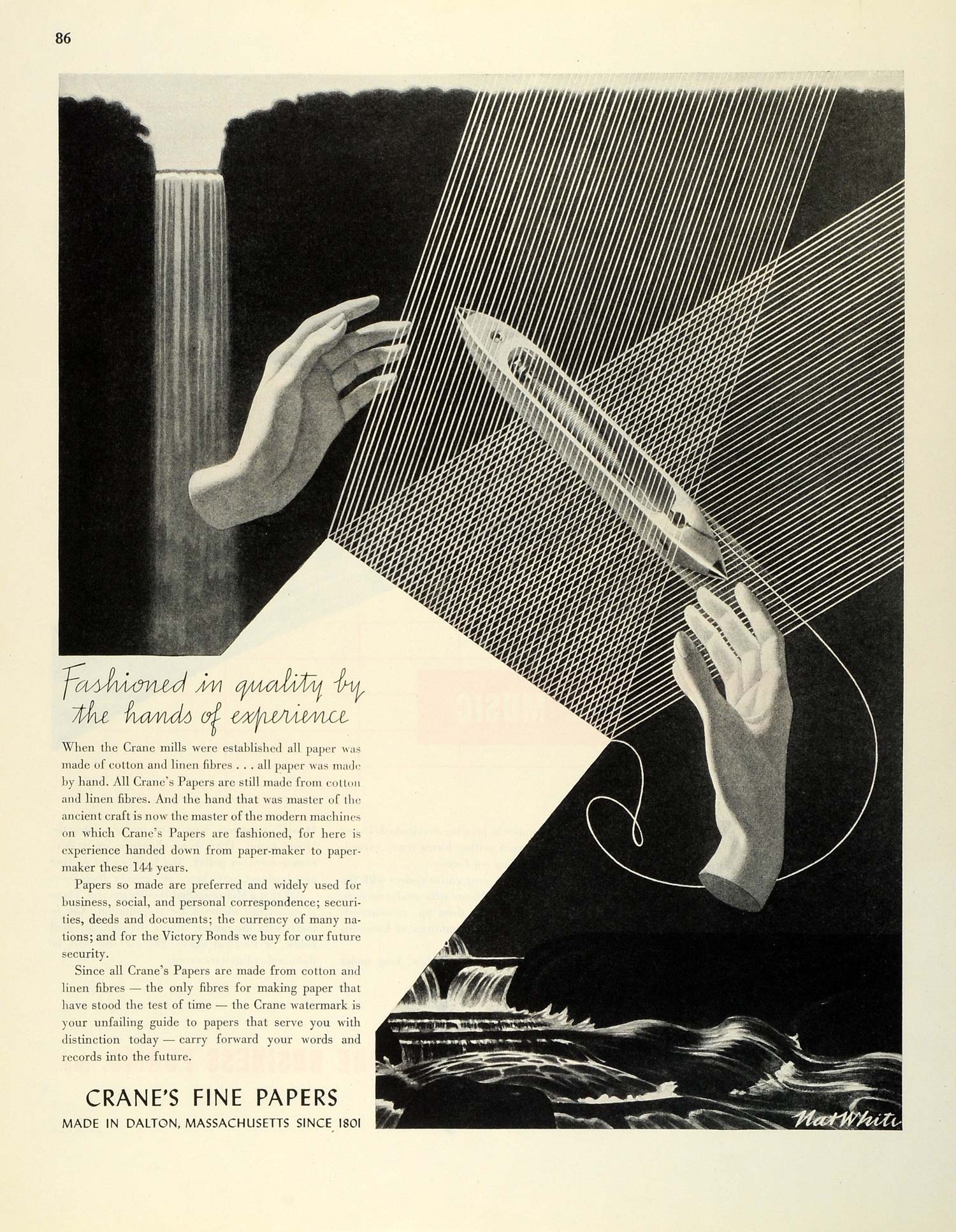 This is an original 1945 black and white print ad for the Crane's Fine Papers made from cotton and linen fibres used for business, social, and personal correspondence.