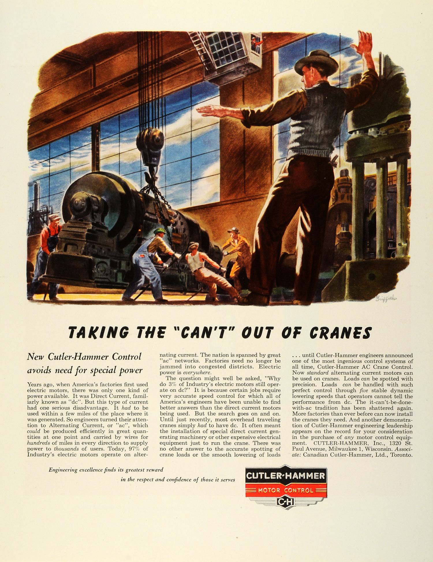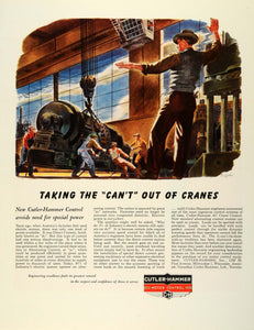 This is an original 1945 World War II color print ad for Cutler Hammer, inc., located at 1320 St. Paul Avenue in Milwaukee, Wisconsin, who are doing their part to aid in the war production efforts by manufacturing a surplus of their equipment for use in war production plants, as well as for use by the U. S. military. This ad features artwork by Harold G. Griffith.
