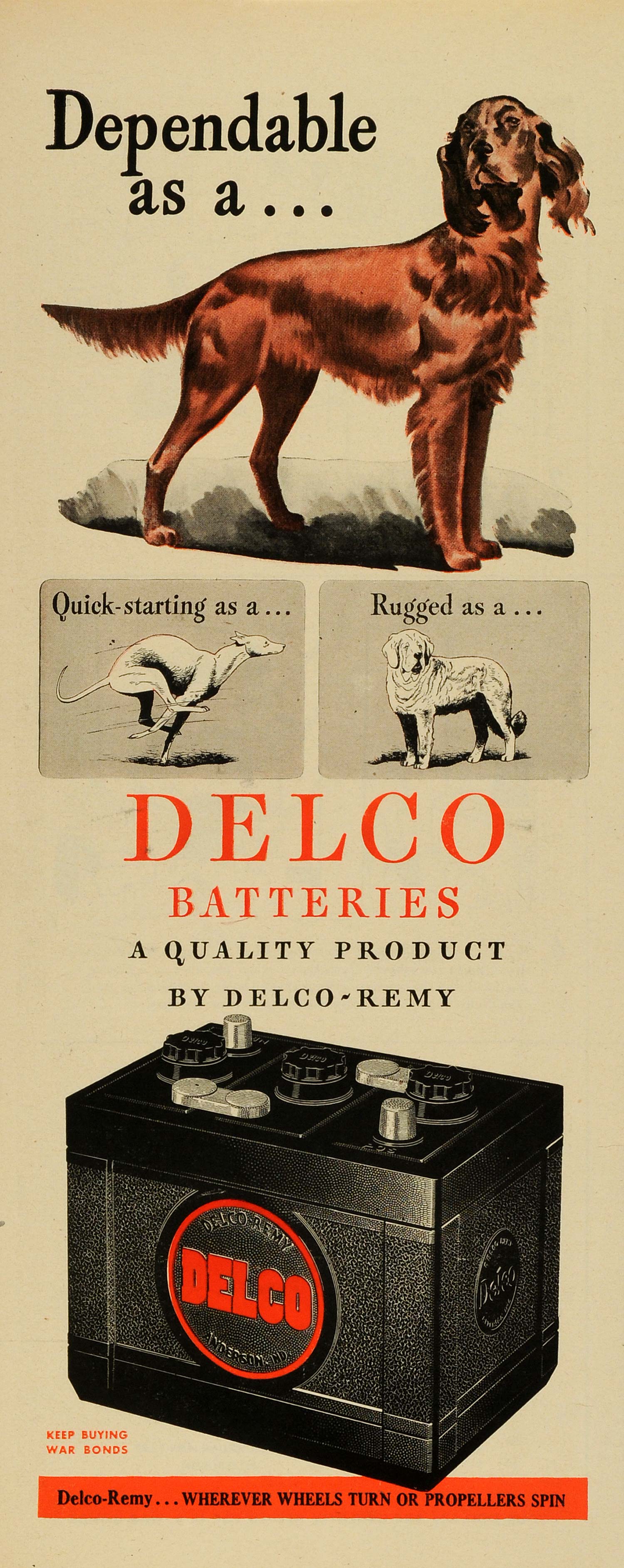 This is an original 1945 two-color print ad for the Delco-Remy Company of Anderson, Indiana; this ad features their Delco automotive batteries.