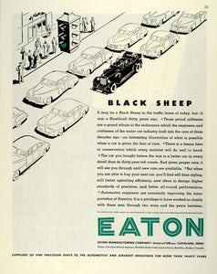 This is an original 1945 two-color print ad for the Eaton Manufacturing Company, suppliers of fine precision parts to the automotive and aircraft industries; located in Cleveland, Ohio.