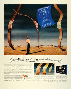 This is an original 1945 color print ad for the Gruen Curvex Collegian, Curvex Companion, and Curvex Consort watches from Gruen Watch Company.