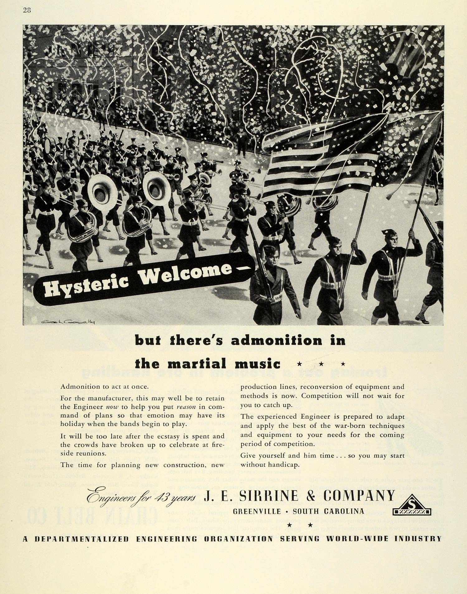 This is an original 1945 World War II black and white print ad for J. E. Sirrine and Company of Greenville, South Carolina.