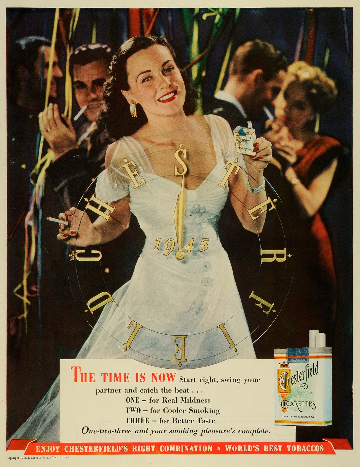 This is an original 1945 color print ad for the Chesterfield Cigarettes from Liggett & Myers Tobacco Company.