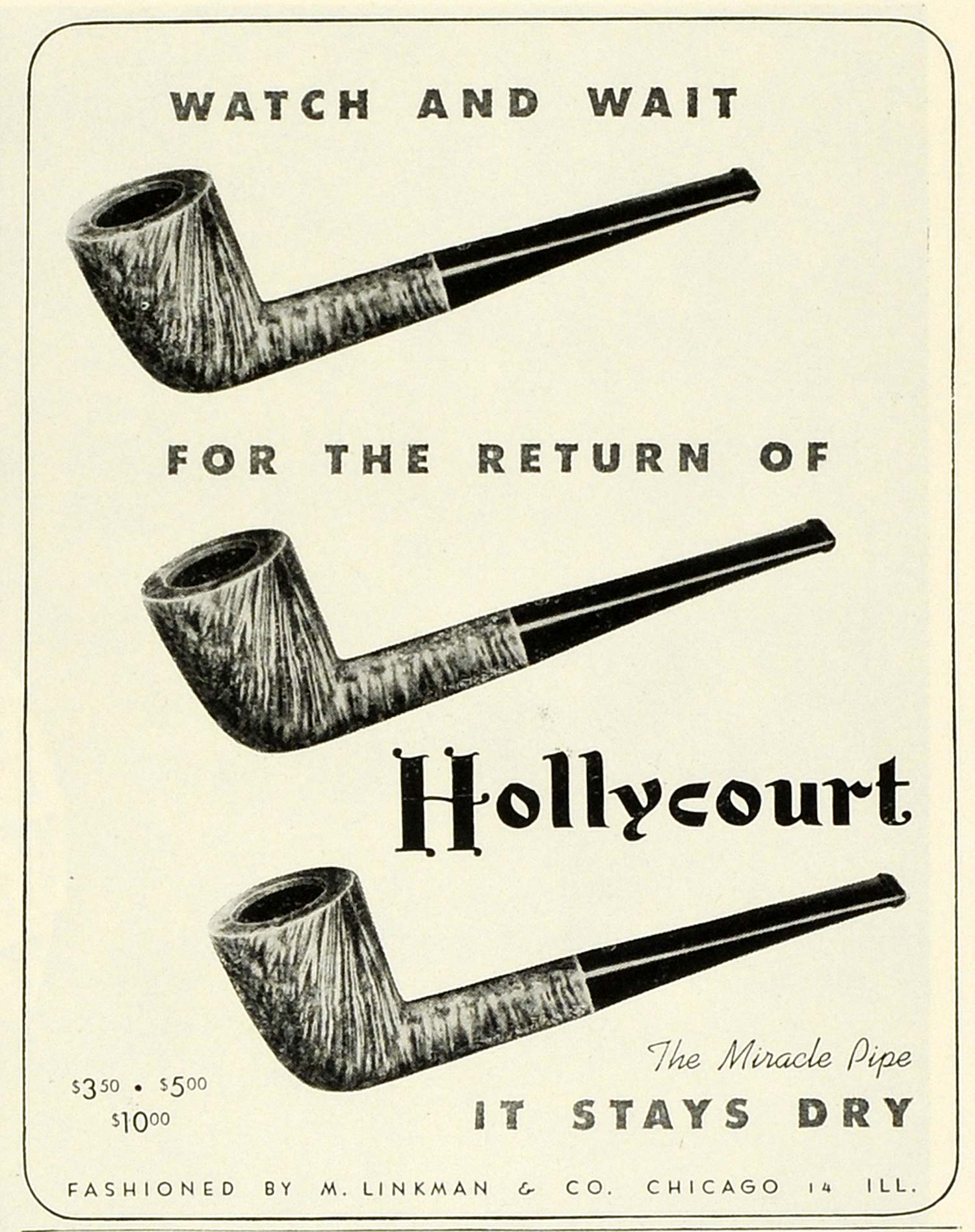 This is an original 1945 black and white print ad promoting tobacco pipes from M. Linkman and Company located in Chicago, Illinois.