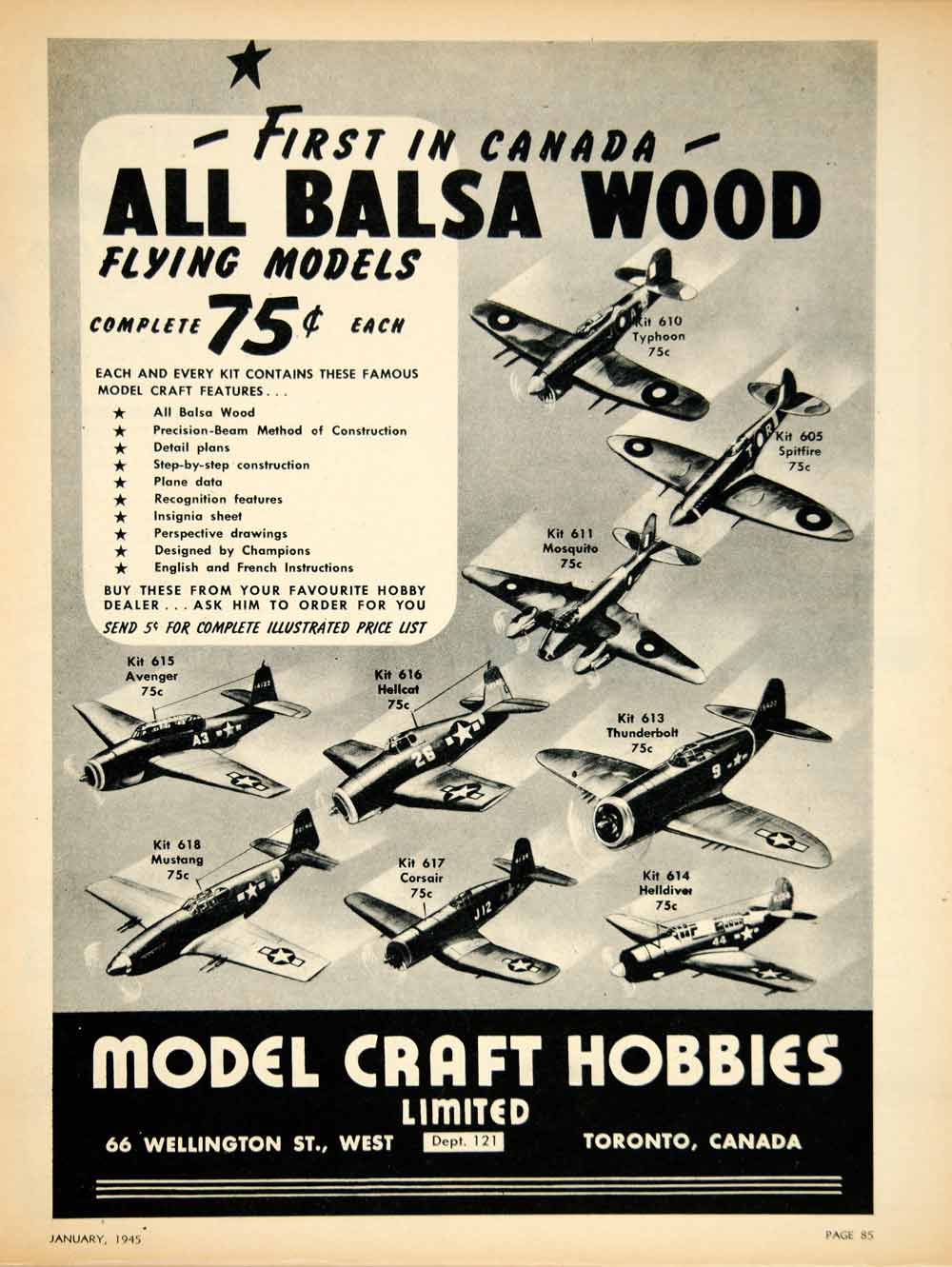 This is an original 1945 black and white print ad for World War II era military aircraft replicas that were made by Model Craft Hobbies Limited of 66 Wellington Street, West Toronto, Canada. Some of the model kits included the; Supermarine Spitfire, Republic P-47 Thunderbolt, Grumman TBF Avenger, Grumman F6F Hellcat, de Havilland DH.98 Mosquito, North American P-51 Mustang, Vought F4U Corsair, and the Curtiss SB2C Helldiver.