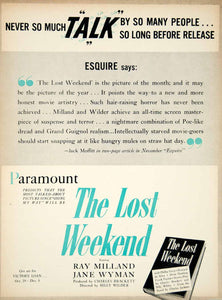 This is an original 1945 two-color print ad for Paramount's 1945 movie "The Lost Weekend," directed by Billy Wilder and starring Ray Milland, Jane Wyman, and Phillip Terry; screenplay by Charles Brackett and Billy Wilder from the novel by Charles R. Jackson.