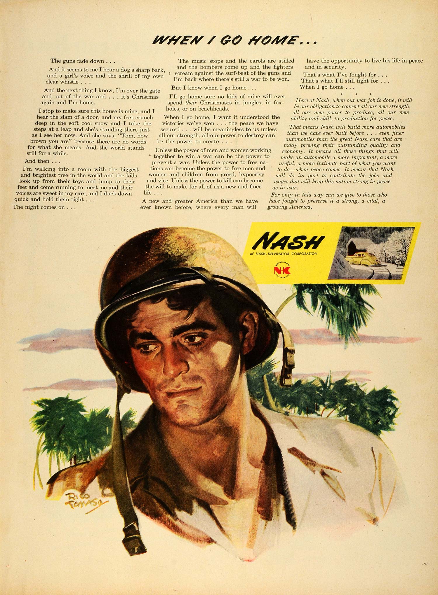 Keywords specific to this image: Vintage Advertising, Nash Motors, car, motor vehicle, WW2, jungle, battle, serviceman