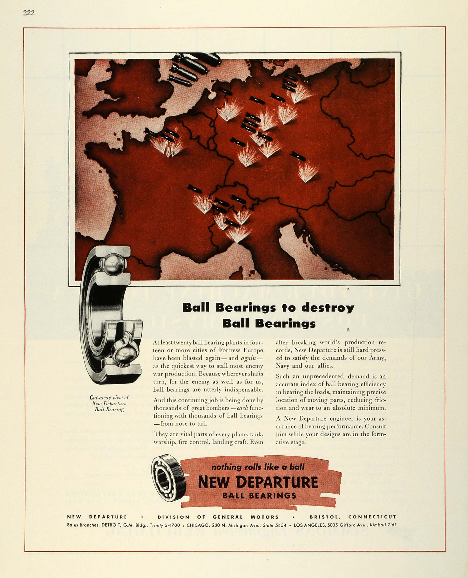 This is an original 1945 World War II two-color print ad for New Departure Ball Bearings, a division of General Motors in Bristol, Connecticut.