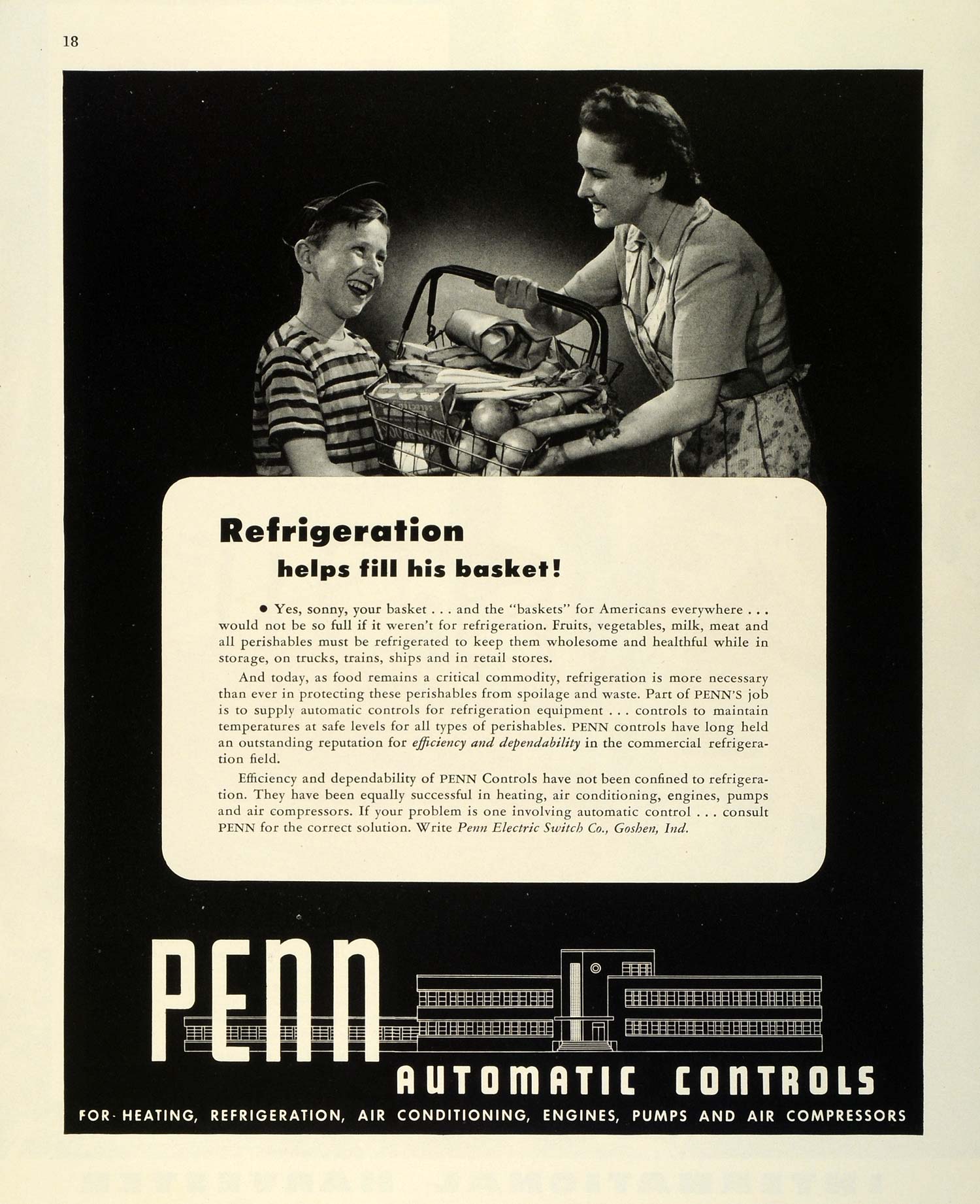 This is an original 1945 black and white print ad for the Penn Automatic Controls for heating, refrigeration, air conditioning, engines, pumps, and air compressors from Penn Electric Switch Company located in Goshen, Indiana.