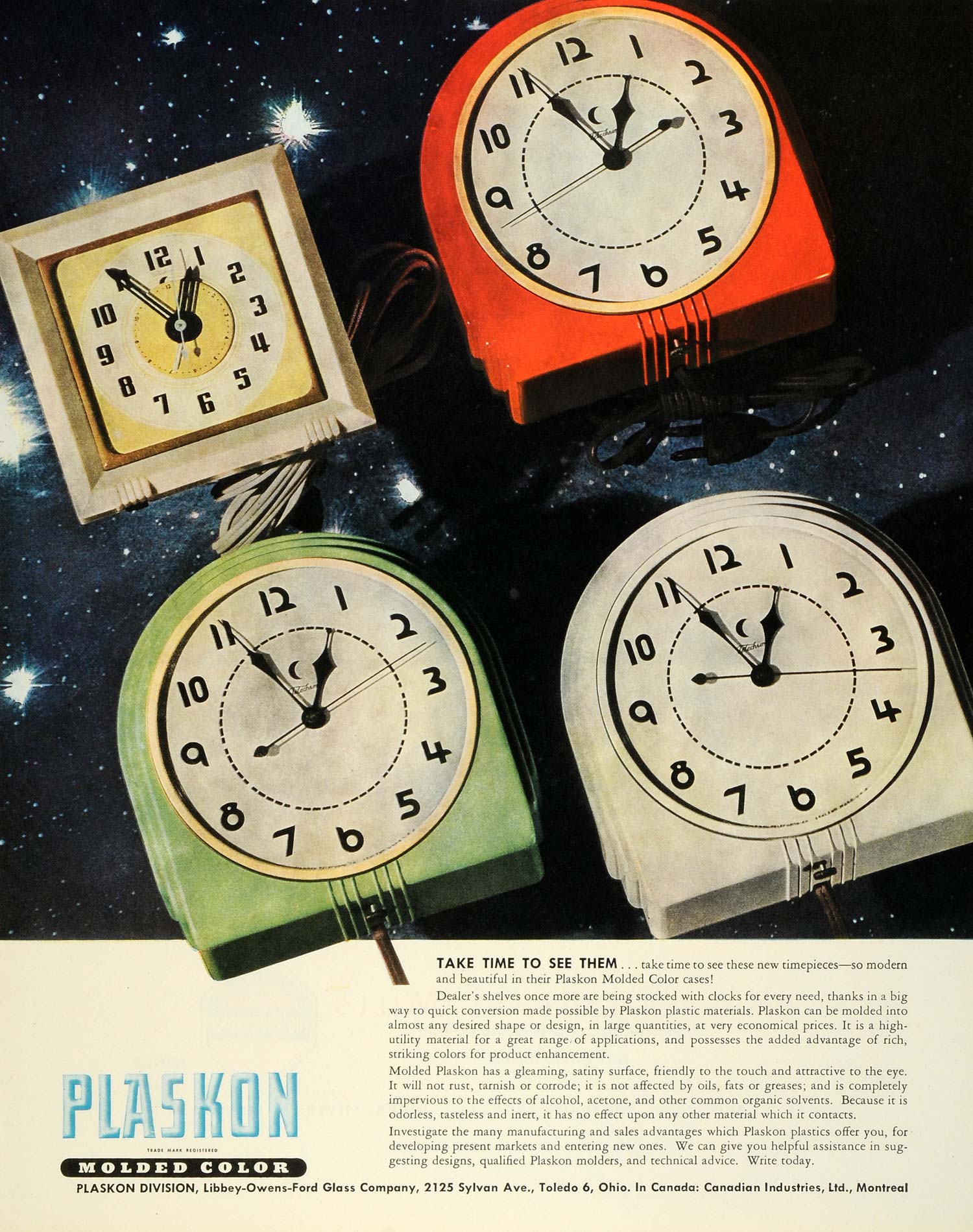 This is an original 1945 color print ad for the Plaskon plastic materials from Plaskon Division, Libbey-Owens-Ford Glass Company located at 2125 Sylvan Avenue, Toledo, Ohio.