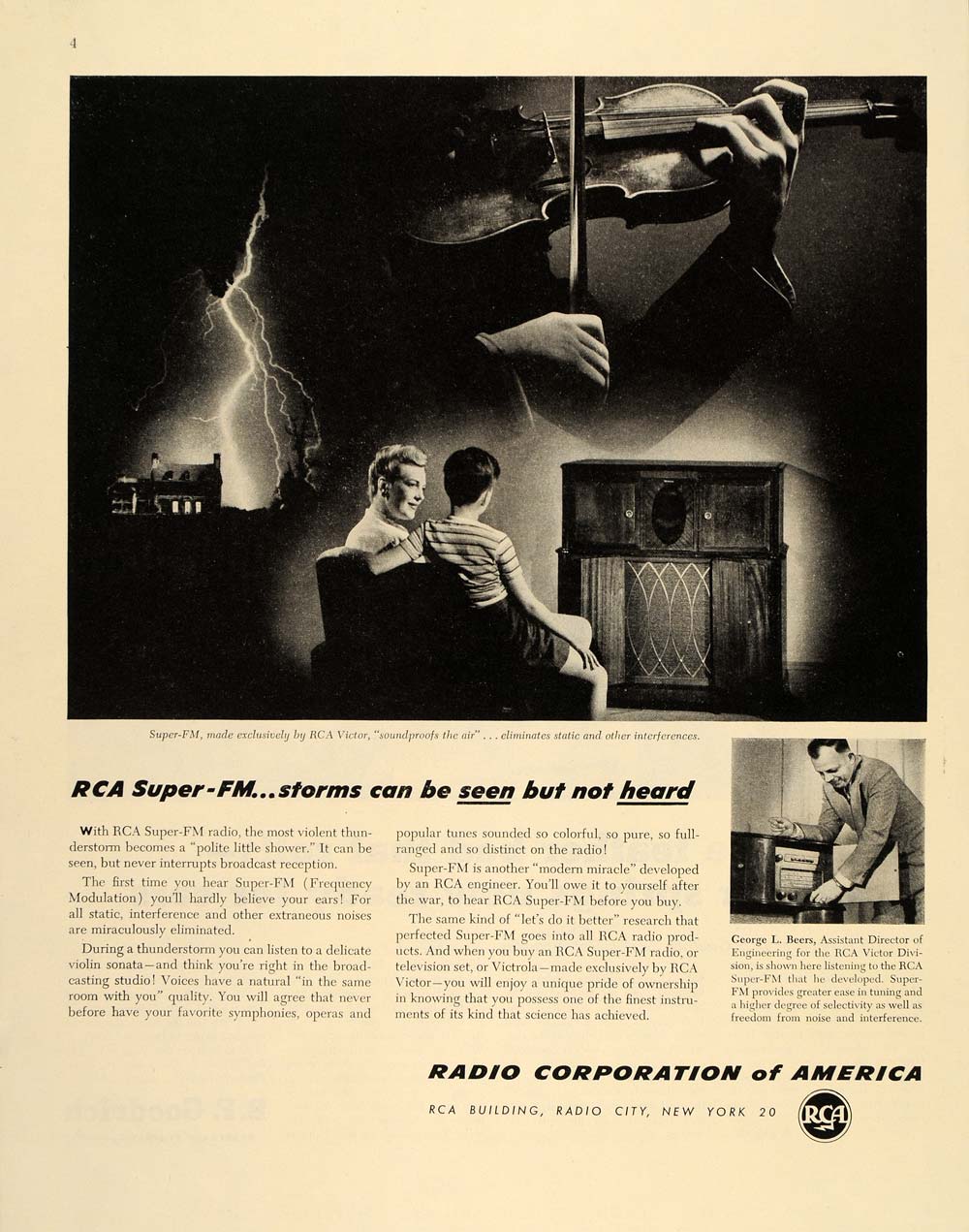 This is an original 1945 black and white print ad for RCA Super FM radio from the Radio Corporation of America.