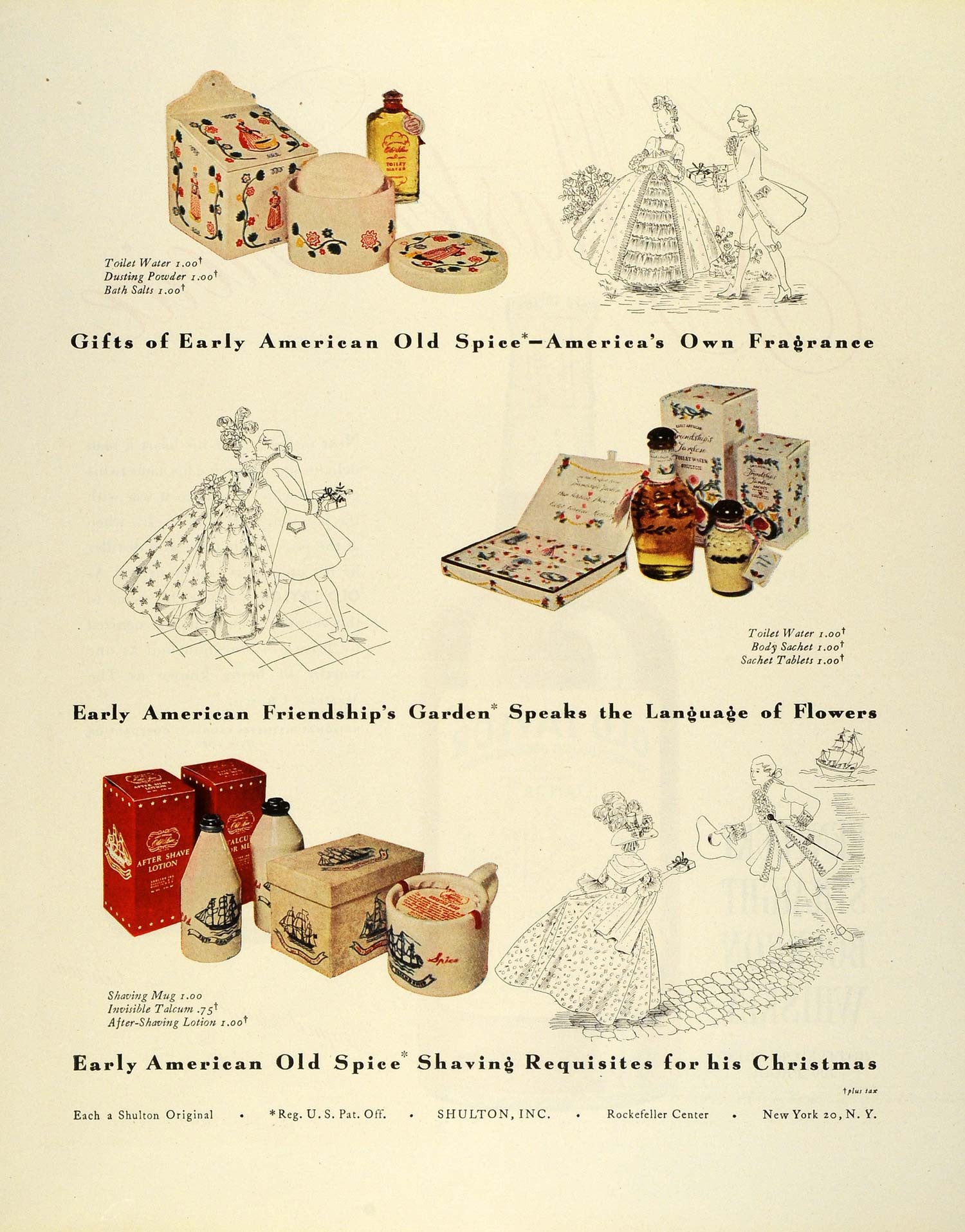 This is an original 1945 color print ad for the Old Spice Toiletries including the Toilet Water, Dusting Powder, Bath Salts, Body Sachet, Sachet Tablets, Shaving Mug, Invisible Talcum, After-shaving lotion from Shulton Incorporation located in Rockefeller Center, New York City.