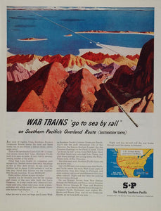 "War trains go to sea by rail...on Southern Pacific's Overland Route...destination Tokyo." This is an original 1945 wartime color print ad from the Southern Pacific Railroad, builder of the 44 mile Lucin Cutoff, a causeway across the Great Salt Lake. Stunning color illustration of the Lucin Cutoff.