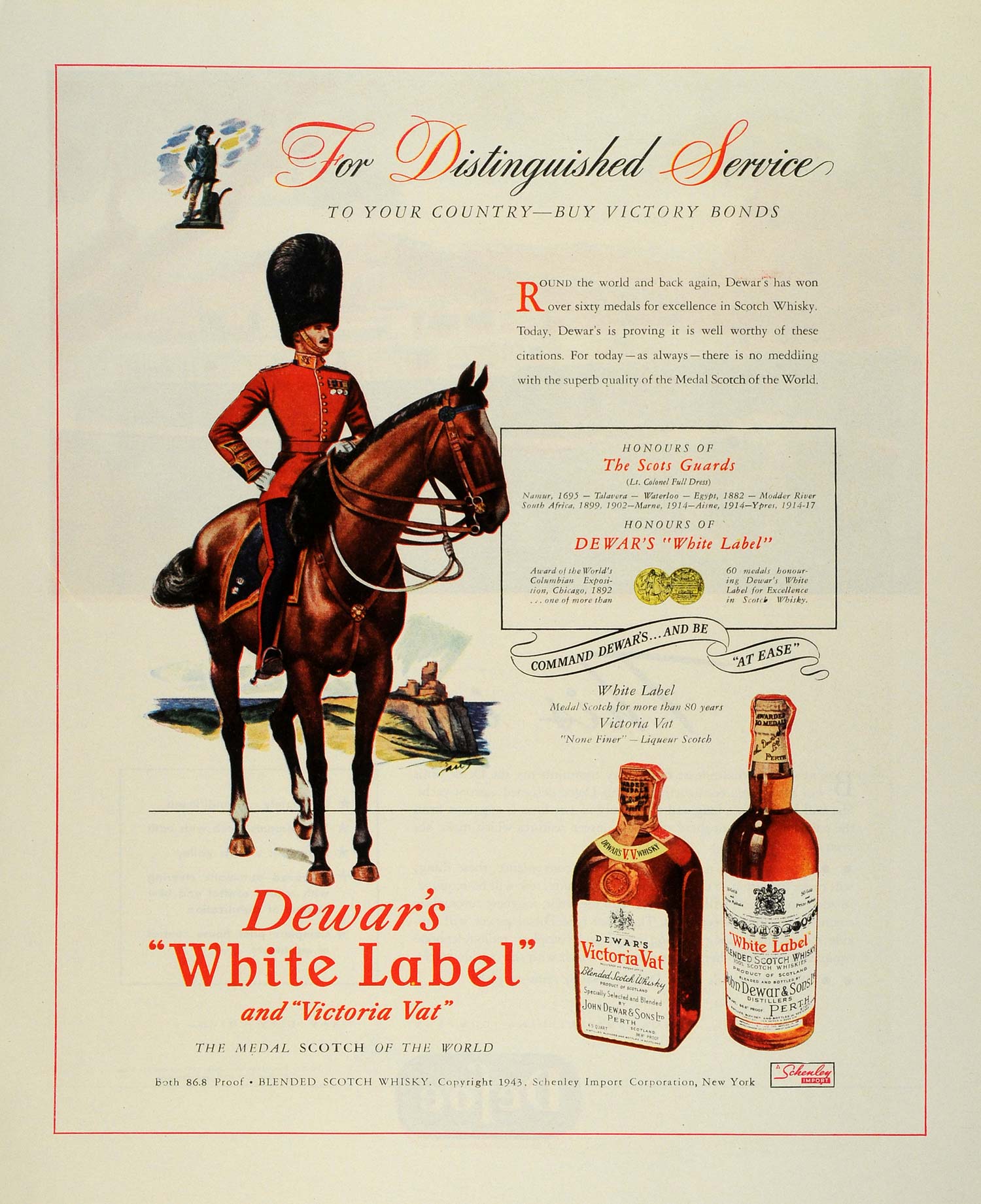 This is an original 1945 color print ad for the Dewar's White Label and Victoria Hat Blended Scotch Whisky from Schenley Import Corporation located in New York.