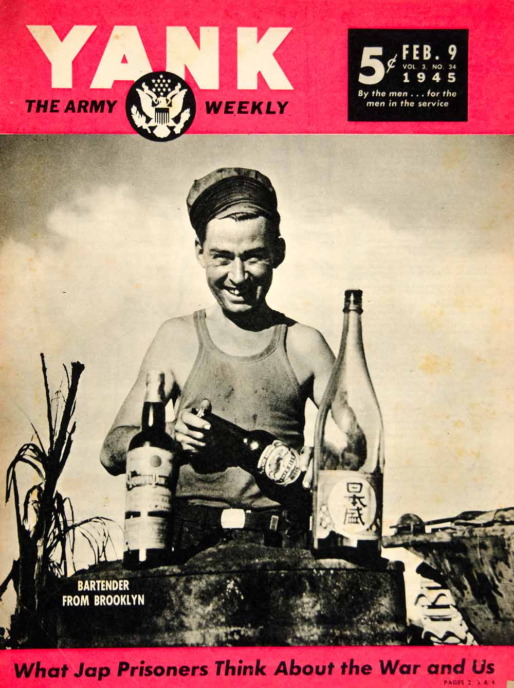 This is an original February 9th, 1945 two-color cover for Yank: The Army Weekly Magazine, featuring Private William J. Frennell, a bartender from Brooklyn, New York, practicing his trade while stationed in Biak, Netherlands New Guinea, serving from a stock of Japanese wine, beer, and sake.CONDITION