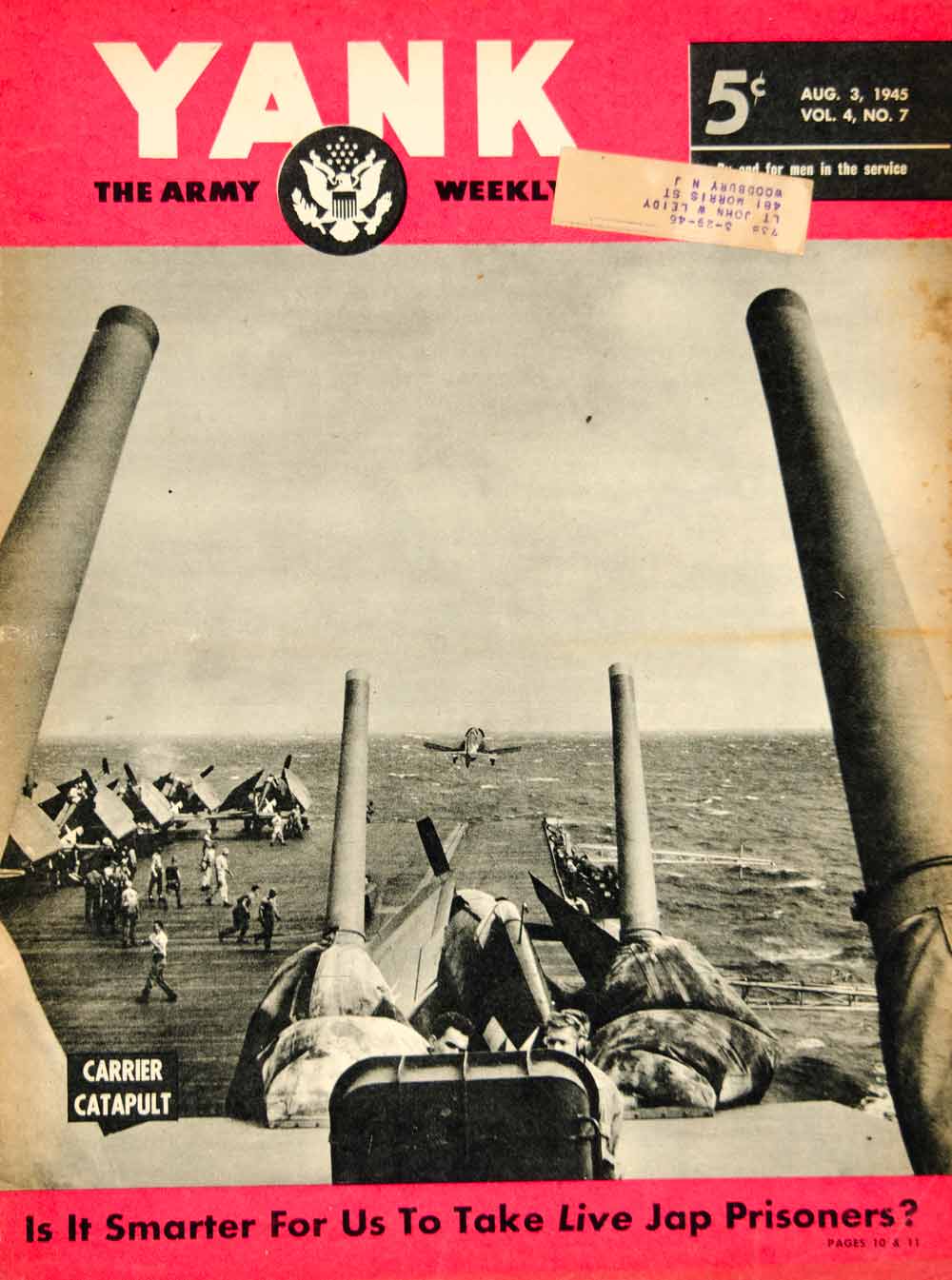 This is an original August 3rd, 1945 two-color cover for Yank: The Army Weekly Magazine, featuring the 5 inch guns and flight deck and catapult takeoff on an aircraft carrier in the Pacific in the final days of World War II.CONDITION