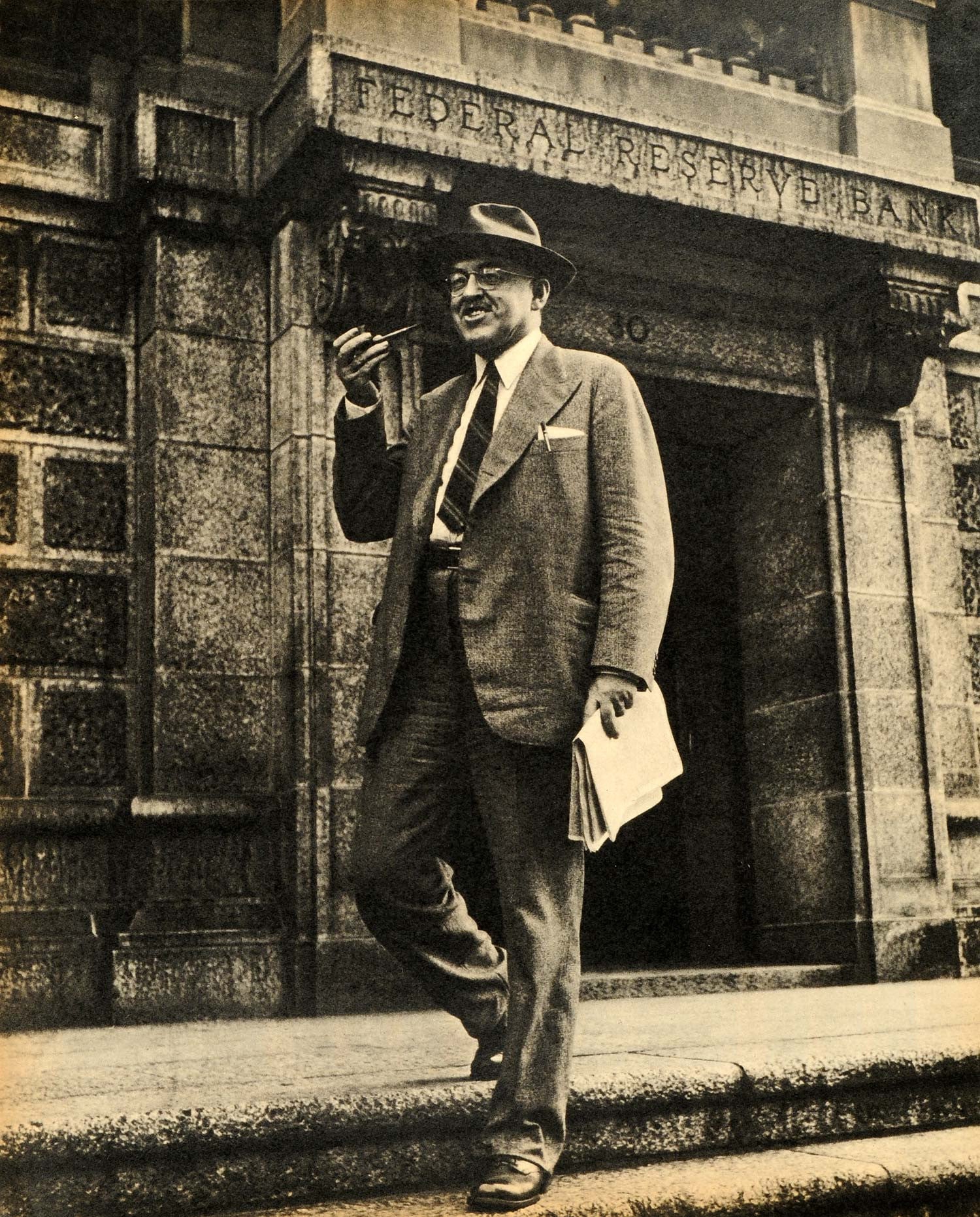 This is an original 1945 halftone print portrait of Ralph Edward Flanders walking in front of the Federal Reserve Bank in Boston, Massachusetts. At the time of this image, Flanders was the president of the Federal Reserve Bank and of Vermont's Jones & Lamson Machine Company as well as the Bryant Chucking Grinder Company. He also served as Vermont's United States Senator from 1946 to 1959.