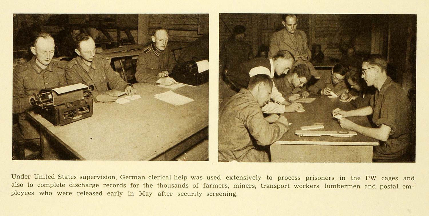 This is an original 1945 halftone print of German workers helping process German prisoners of war under United States supervision. The caption writes, "... German clerical help was used extensively to process prisoners in the PW cages and also to complete discharge records for the thousands of farmers, miners, transport workers, lumber men and postal employees who were released early in May after security screening."