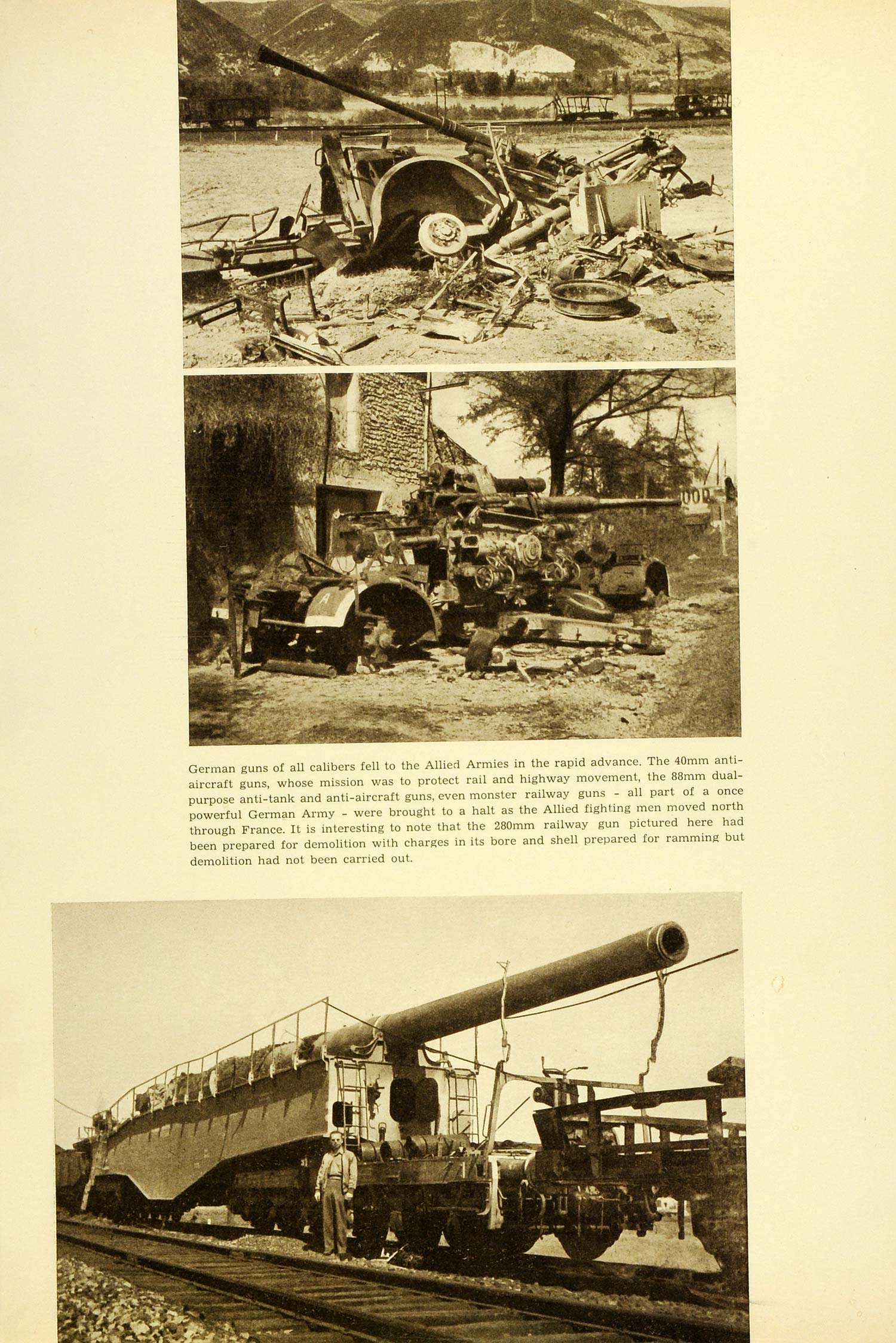 This is an original 1945 halftone print of various weapons used by Germany during World War II. Shown is a 40mm anti-aircraft gun, an 88mm anti-tank and anti-aircraft gun, and a railway gun. The caption writes, "It is interesting to note that the 280mm railway gun pictured here had been prepared for demolition with charges in its bore and shell prepared for ramming but demolition had not been carried out."