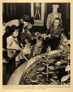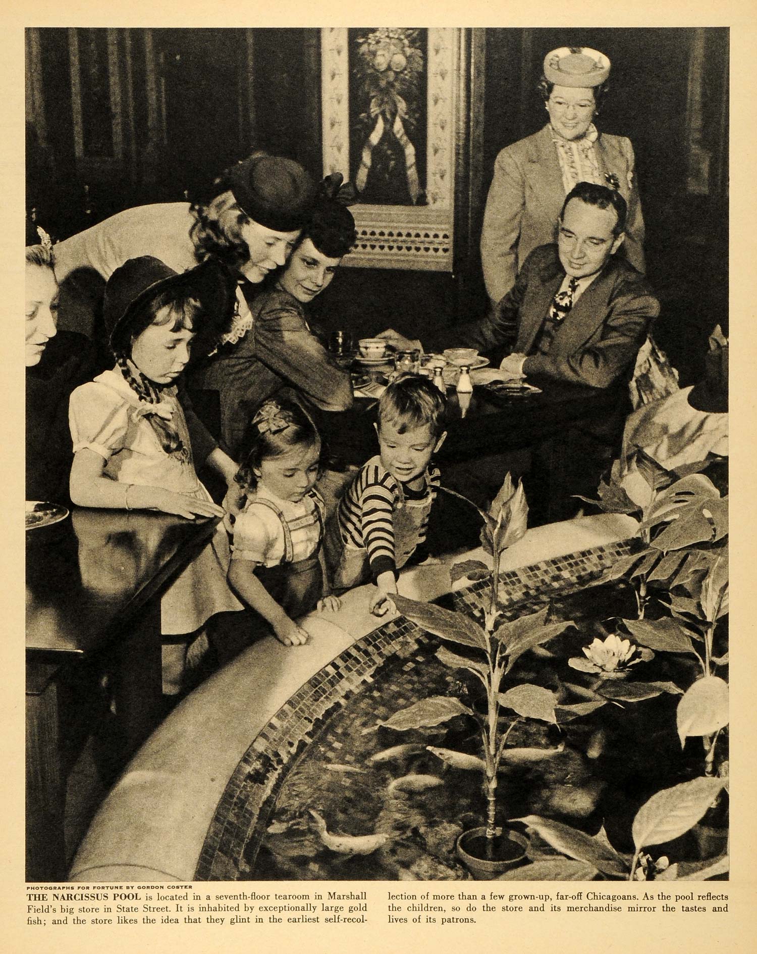 This is an original 1945 halftone print of the Narcissus Pool located in the Marshall Fields department store in Chicago, Illinois. The caption writes, "The Narcissus Pool is located in a seventh-floor tearoom in Marshall Field's big store in State Street. It is inhabited by exceptionally large goldfish; and the store likes the idea that they glint in the earliest self-recollection of more than a few grown-up, far-off Chicagoans."