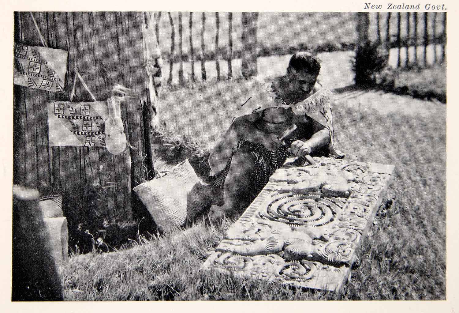 This is an original 1945 black and white halftone print of a man who is a part of the Maori culture in New Zealand, Carving in Rotorua.