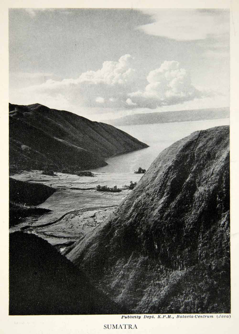 This is an original 1945 black and white halftone print of the Indonesian Island of Sumatra. Sumatra borders the Indian Ocean to the West.