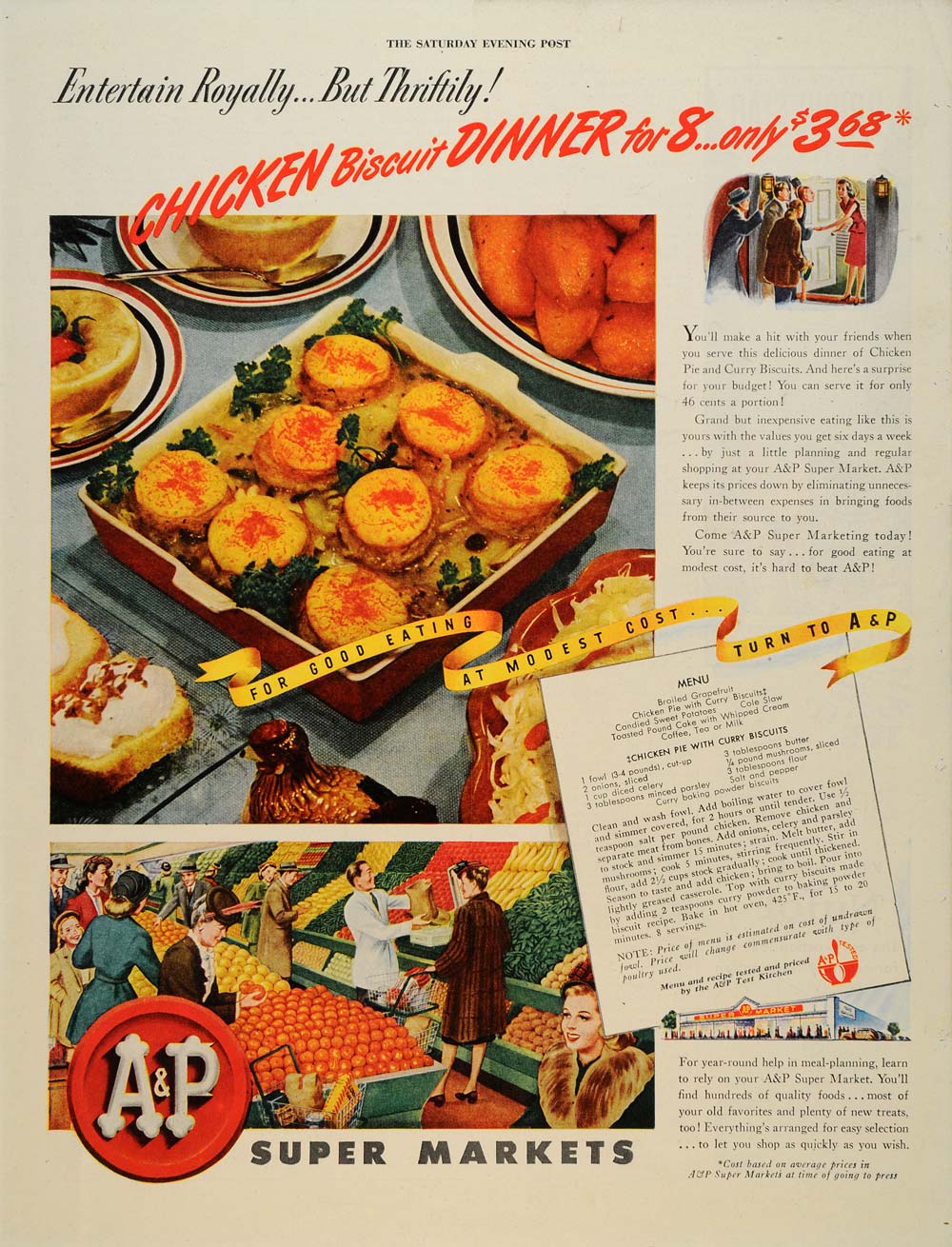 This is an original 1946 color print ad for A&P Super Markets. This ad highlights its quality, yet inexpensive products. The ad also features an A&P Kitchen tested menu and recipe for Chicken Pie with Curry Biscuits, as well as a list of sides, dessert and beverages.