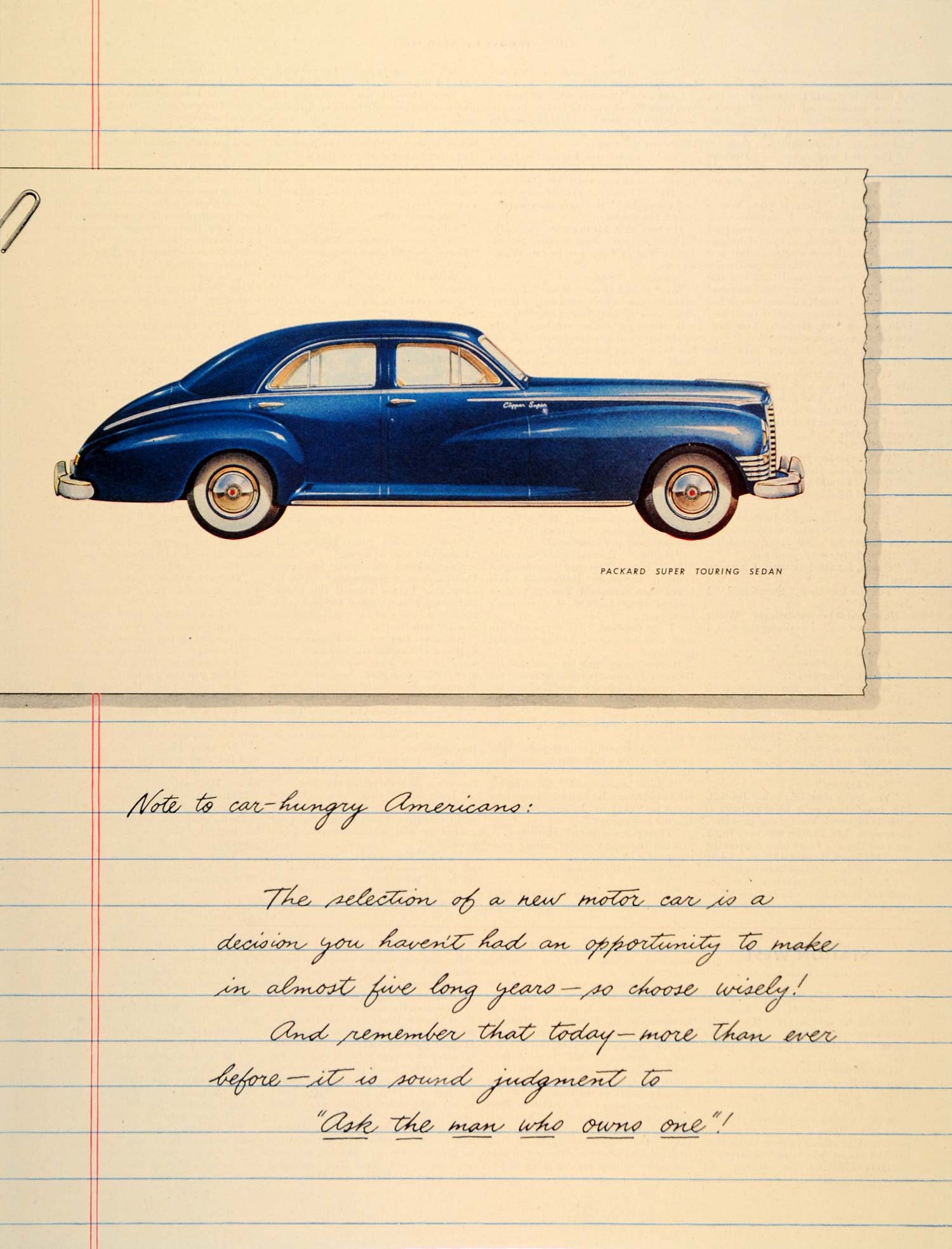 This is an original 1946 color print ad for the Packard Super Touring Sedan. This ad really stands out for its simplicity, creative layout and striking illustrated blue vintage Packard automobile.