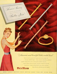 This is an original 1946 color print ad for Bretton Ladies Watch Bands by Bruner-Ritter Inc. located at 630 Fifth Avenue, New York City 20, New York.