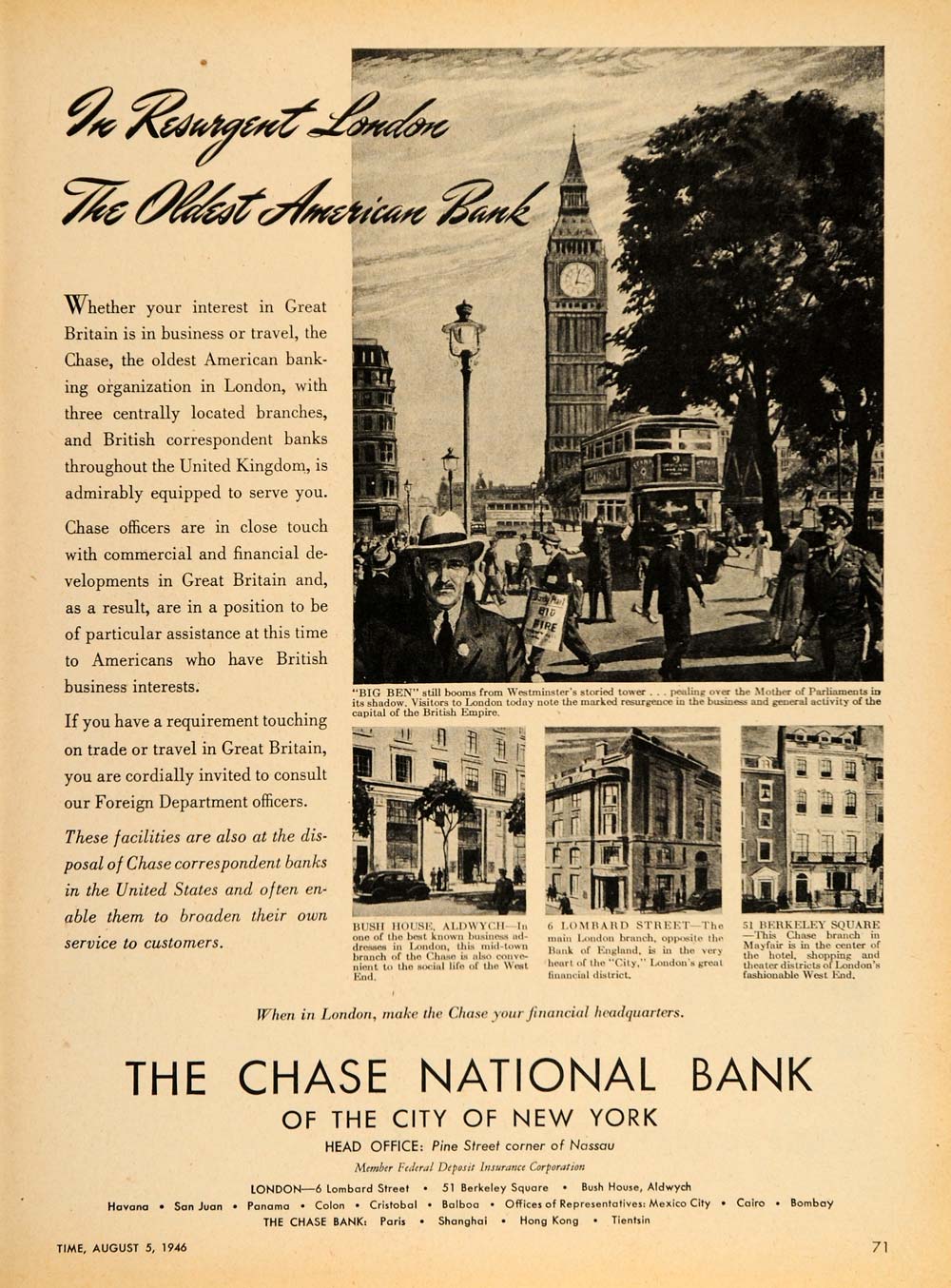 This is an original 1946 black and white print ad for the three London branches of The Chase National Bank of the City of New York: Bush House, Aldwych; 6 Lombard Street; and 51 Berkeley Square.