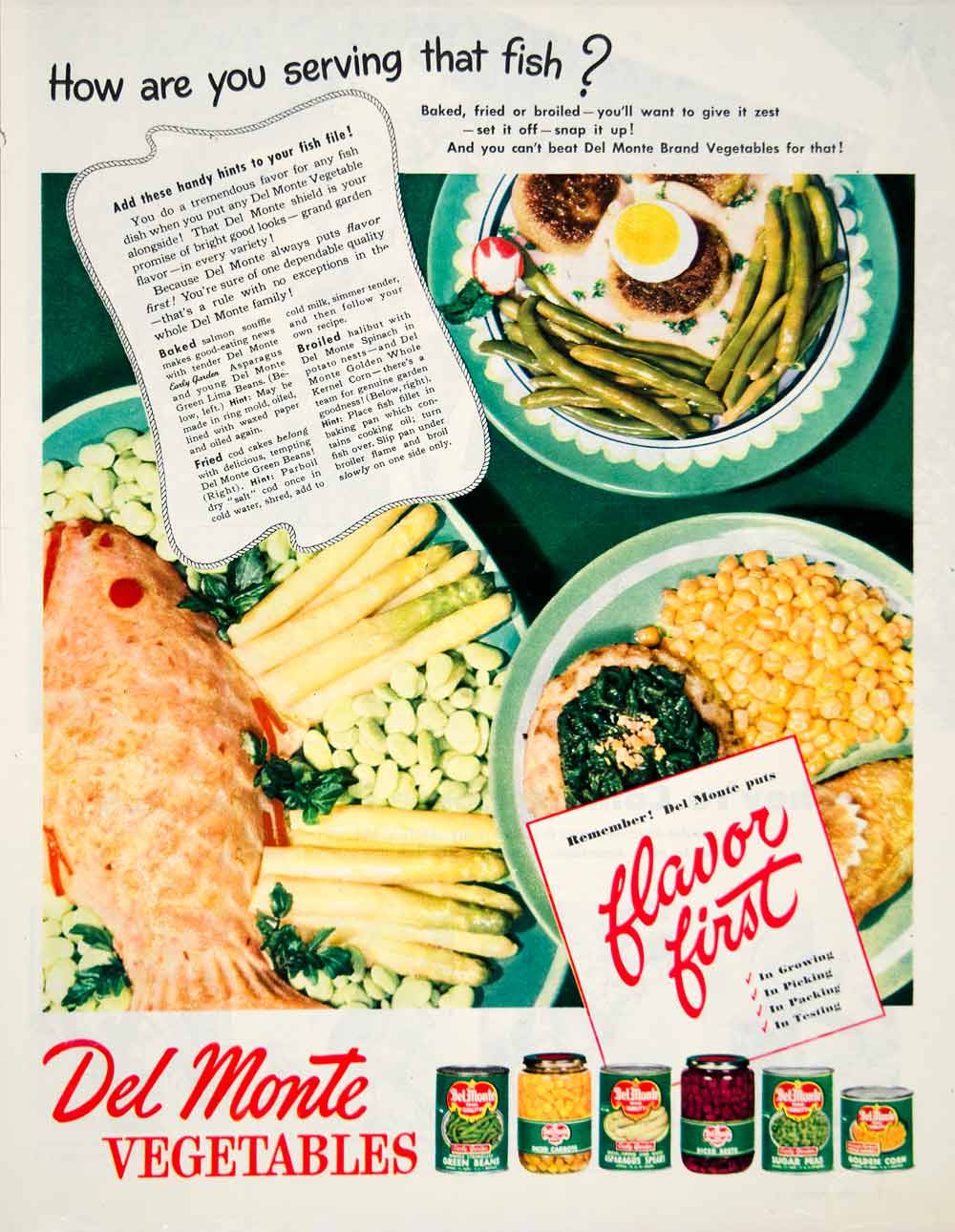 This is an original 1946 color print ad for green beans, diced carrots, asparagus spears, diced beats, sugar peas, corn, and other canned vegetables that were made and sold by Del Monte.
