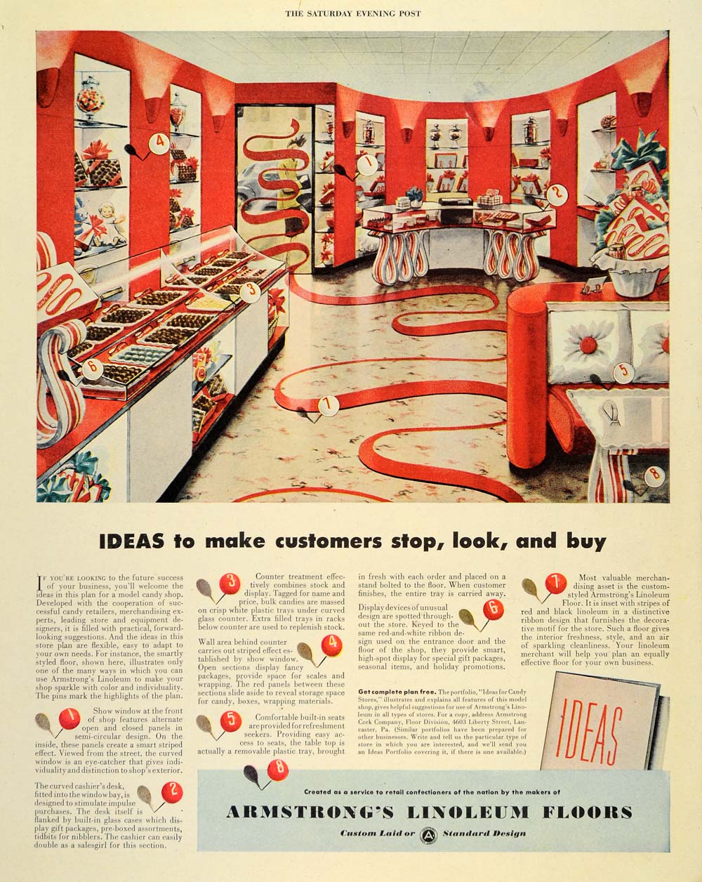 This is an original 1946 color print ad for Armstrong's Linoleum Floors, custom laid or standard designs by the Armstrong Cork Company, Floor Division located at 373 West Liberty Street, Lancaster, Pennsylvania.