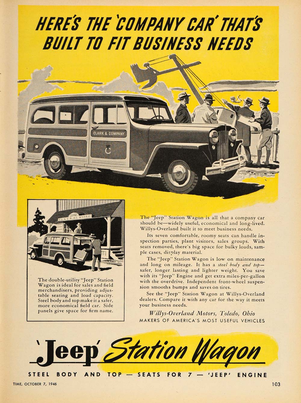 This is an original 1946 two-color print ad for the Jeep Station Wagon from Willys-Overland Motors of Toledo, OH.
