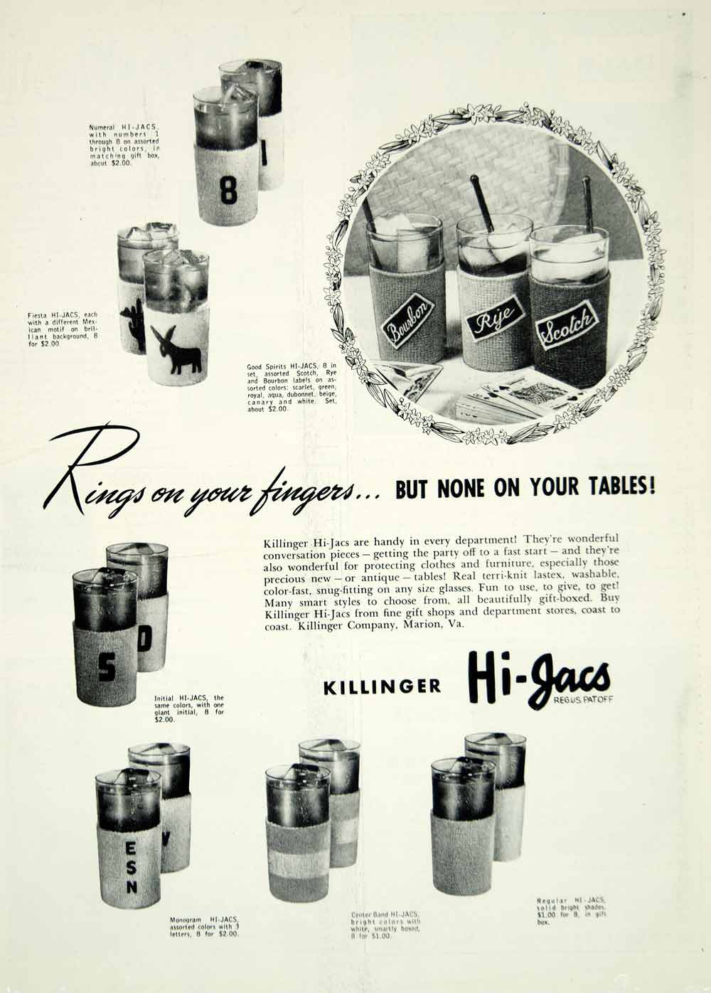 This is an original 1946 black and white print ad for Hi-Jacs drink sleeves that were made and sold by the Killinger Company of Marion, Virginia (VA).