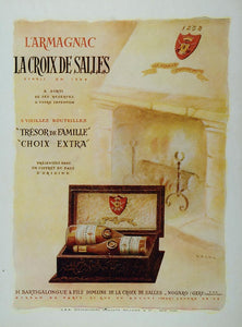 This is an original 1946 French ad for La Croix de Salles L'Armagnac Brandy, illustrated by R. B. Sibia.