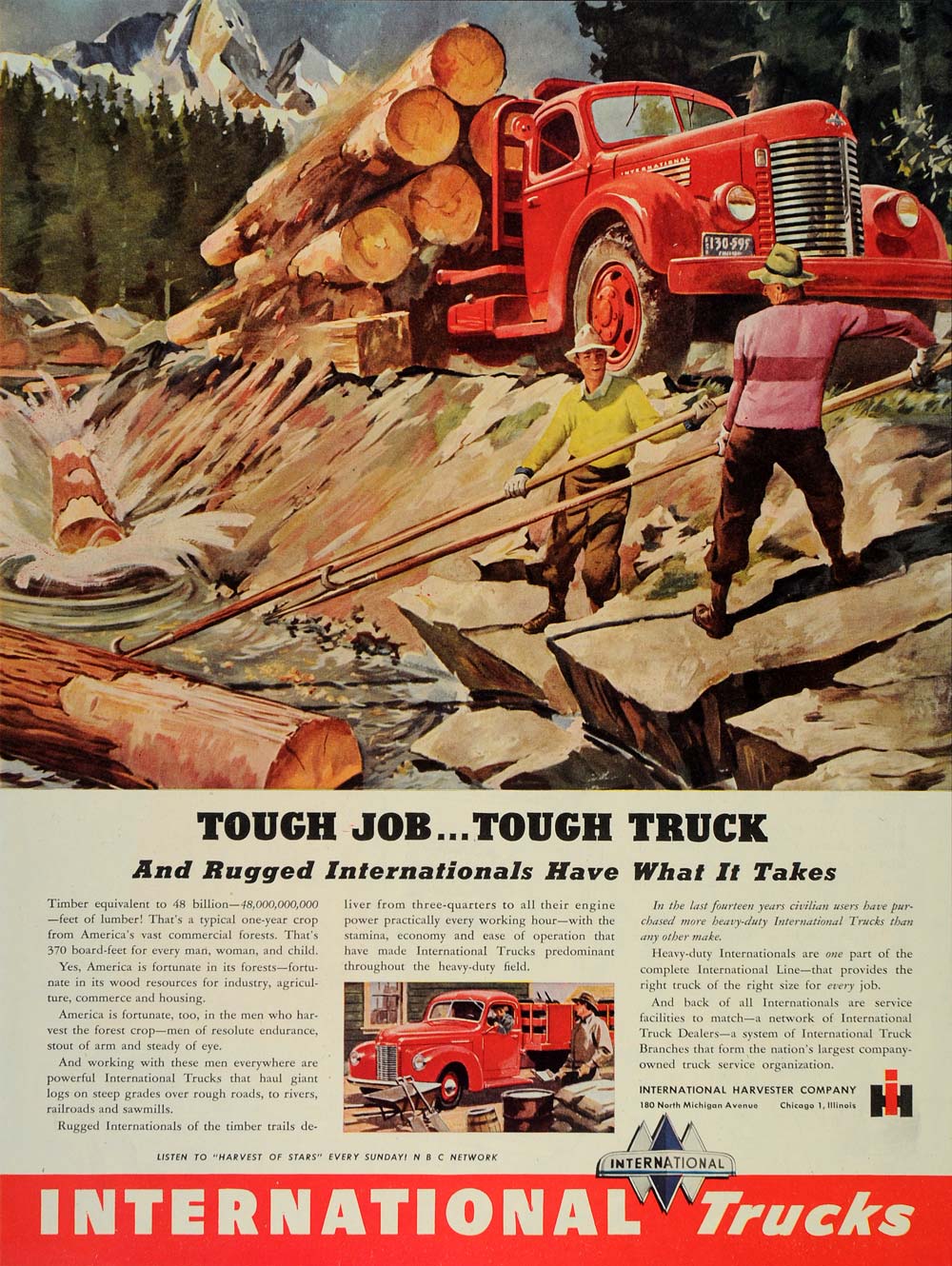 This is an original 1946 color print ad for International Trucks by the International Harvester Company located at 606 South Michigan Avenue, Chicago, Illinois.