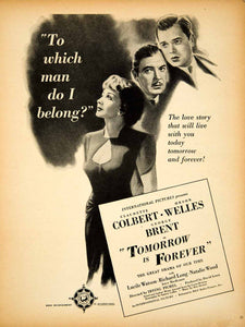 This is an original 1946 black and white print ad for the 1946 International Picture film-noir movie "Tomorrow is Forever," directed by Irving Pichel and starring Claudette Colbert, Orson Welles, and George Brent; screenplay by Lenore J. Coffee. Produced by David Lewis.