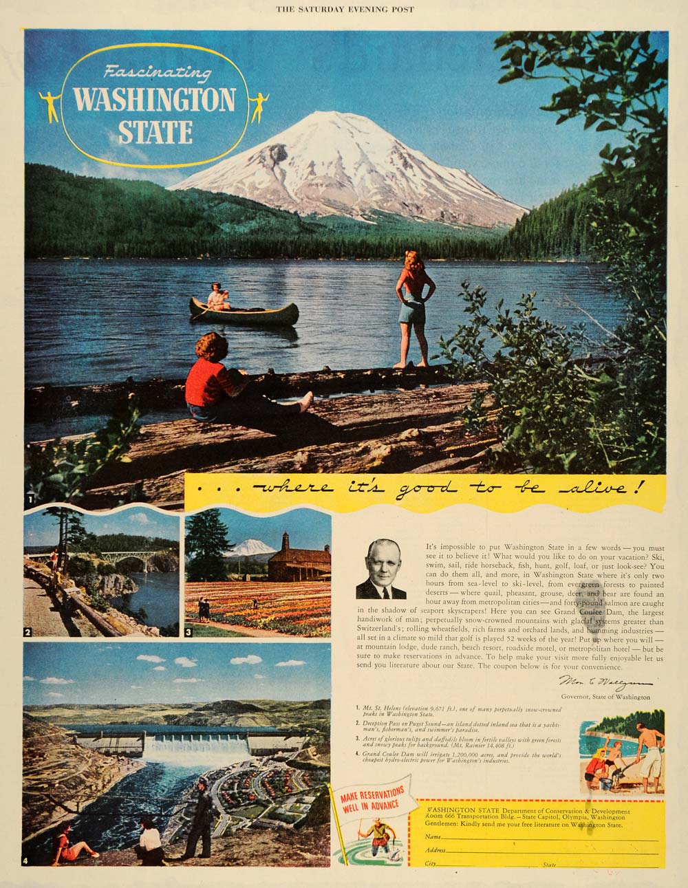 This is an original 1946 color print ad for vacationing in Washington State by the Washington State Department of Conservation and Development located in Olympia, Washington.