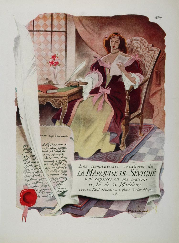 This is an original 1946 French ad for La Marquise de SŽvignŽ fine chocolates. The lovely illustration is of the original Marquise de SŽvignŽ, 1626Ð96, a French woman of letters.
