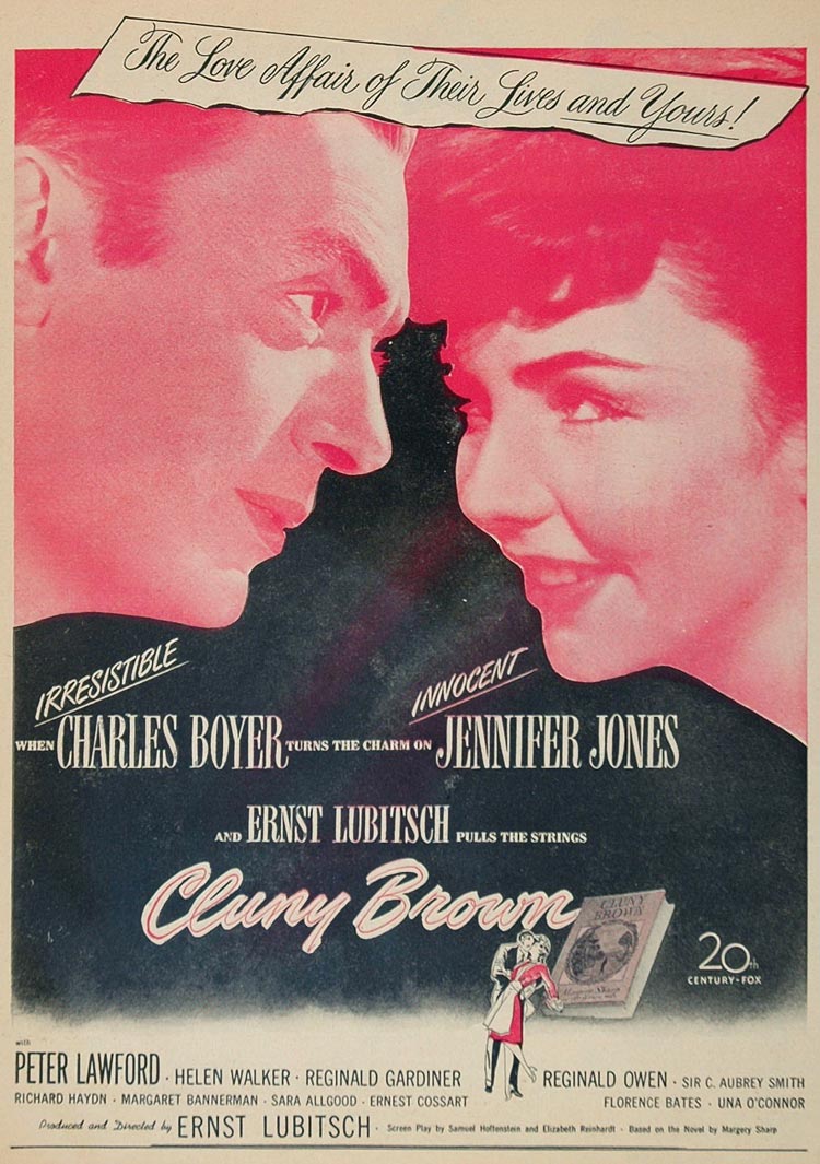This is a 1946 two-color print ad for the movie "Cluny Brown" starring Charles Boyer, Jennifer Jones, with Peter Lawford. Produced and directed by Ernst Lubitsch, based on the novel by Margery Sharp. A 20th Century-Fox picture.