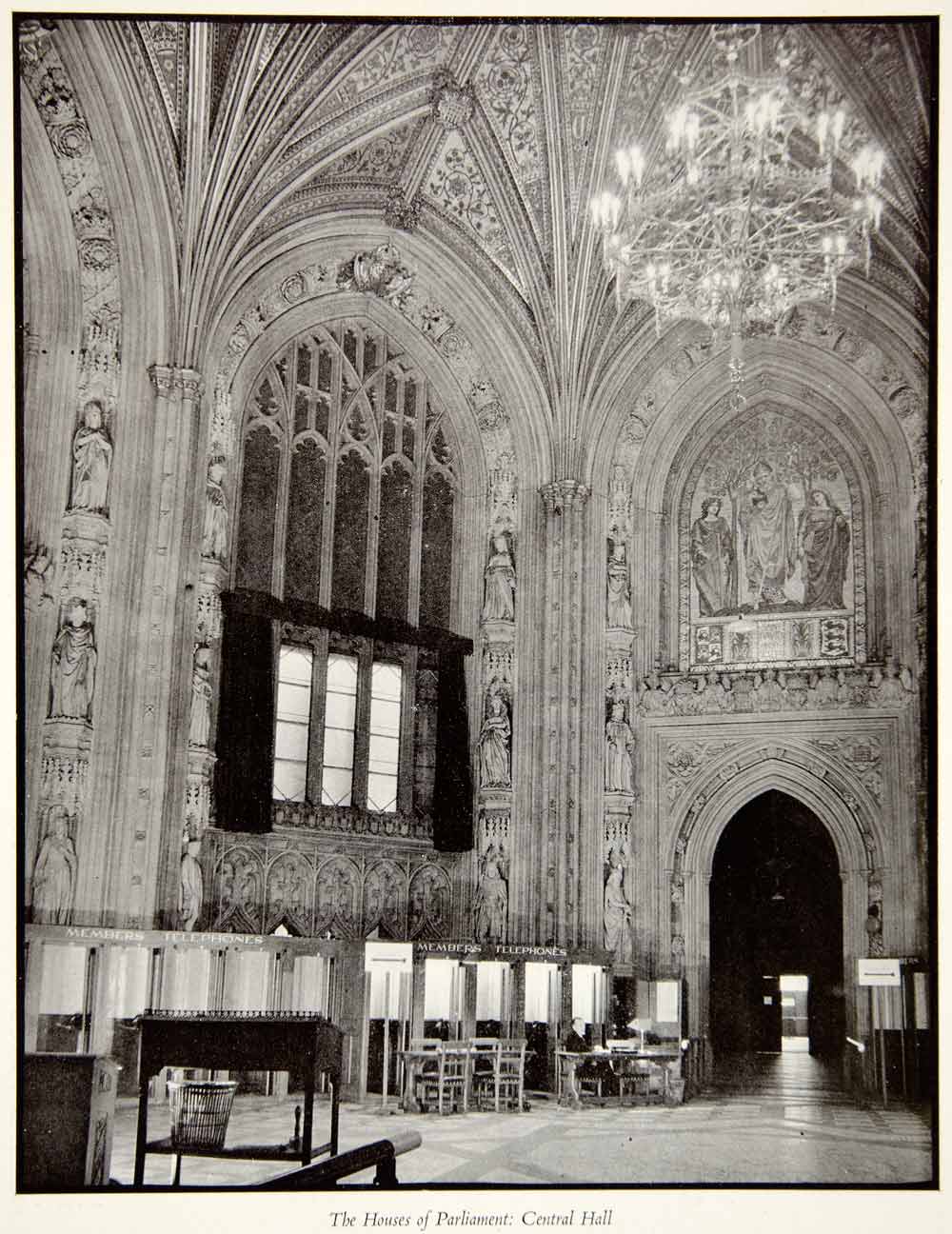 This is an original 1946 black and white halftone print featuring the Central Hall of the Palace of Westminster, a meeting place of the Parliament of the United Kingdom located on the north bank of Thames River in the city of London, England. Photography by Hans Wild.