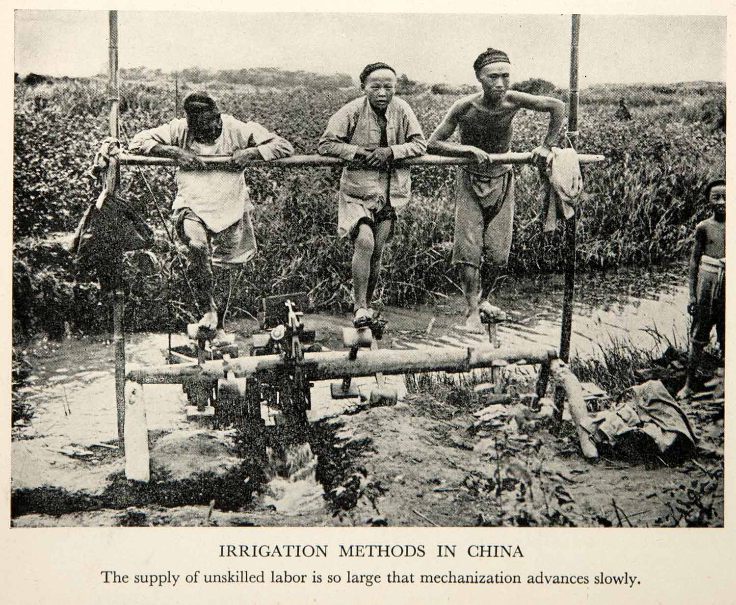 This is an original 1946 black and white halftone print of irrigation methods in China prior to the advancements of mechanization.