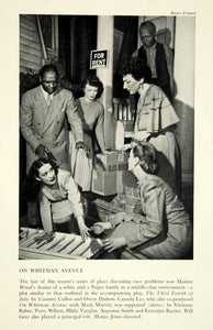 This is an original 1946 black and white halftone print of actor Canada Lee dressed in costume for his role as David Bennett, actress Vivian Baber as Wini Bennett, Perry Wilson as Toni Tilden, Hilda Vaughn as Aunrie Anderson, Augustus Smith as Gramp Bennett, and Ernestine Barrier as Kate Tilden, in a scene from the 1946 Broadway drama, "On Whitman Avenue", by Maxine Wood.