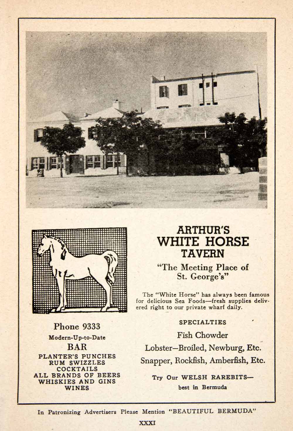 This is an original 1947 black and white print ad for Arthur's White Horse Tavern at St. George's in Bermuda.