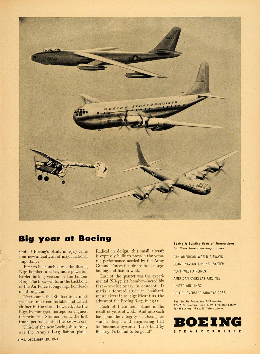 This is an original 1947 black and white print ad for the new 1947 airplanes from Boeing: the Boeing B-50 bomber; the Stratocruiser; the Army's L-15 liaison plane; and the experimental XB-47 jet bomber.