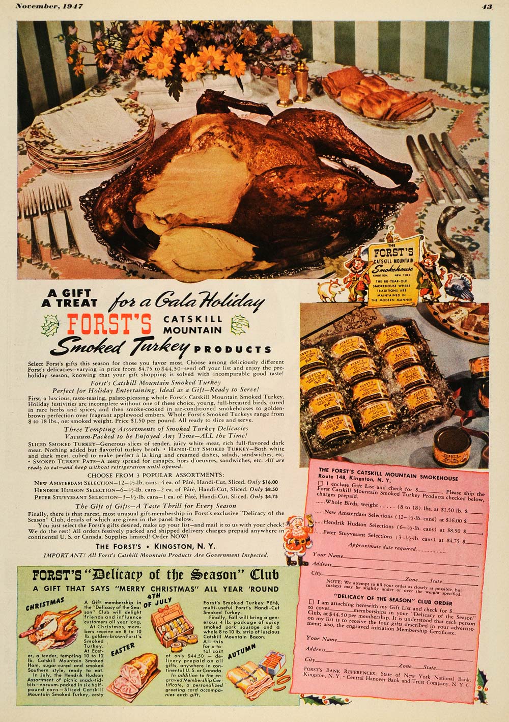 This is an original 1947 color print ad for the Forst's Catskill Mountain Smoked Turkey Products from Fort's Catskill Mountain Smokehouse located in Kingston, New York.